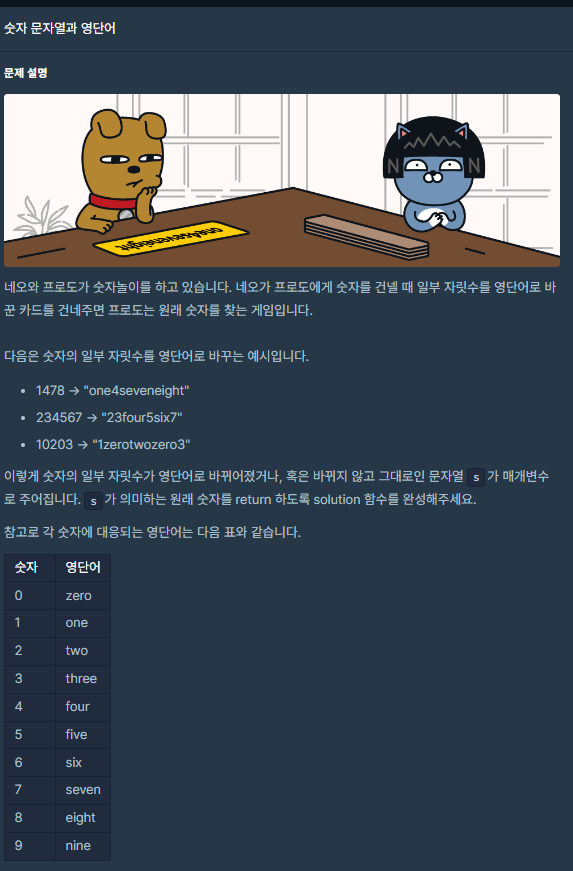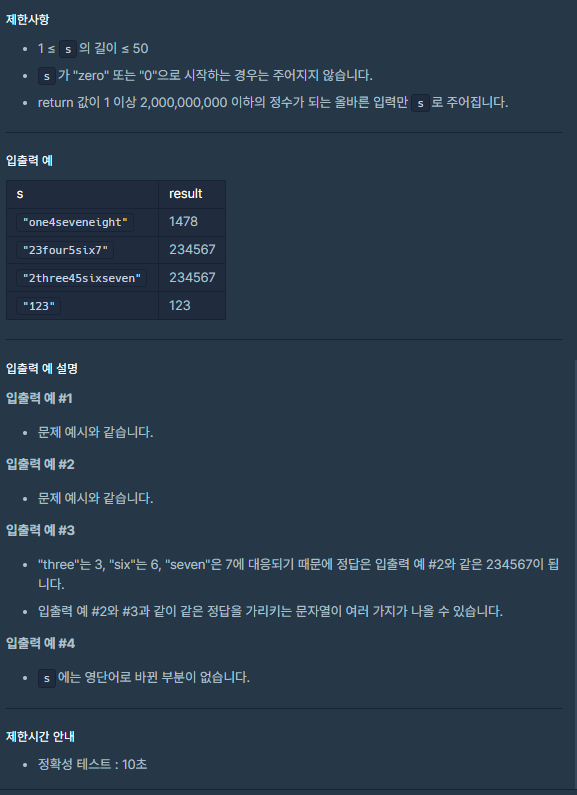 String 형으로 주어졌기 때문에 num 과 word 라는 배열을 만든 뒤 for 문을 활용하여 replace 를 해준다음 Integer.valueOf() 함수를 사용해서 int 형으로 형변환 시켜준뒤 return 하였다!